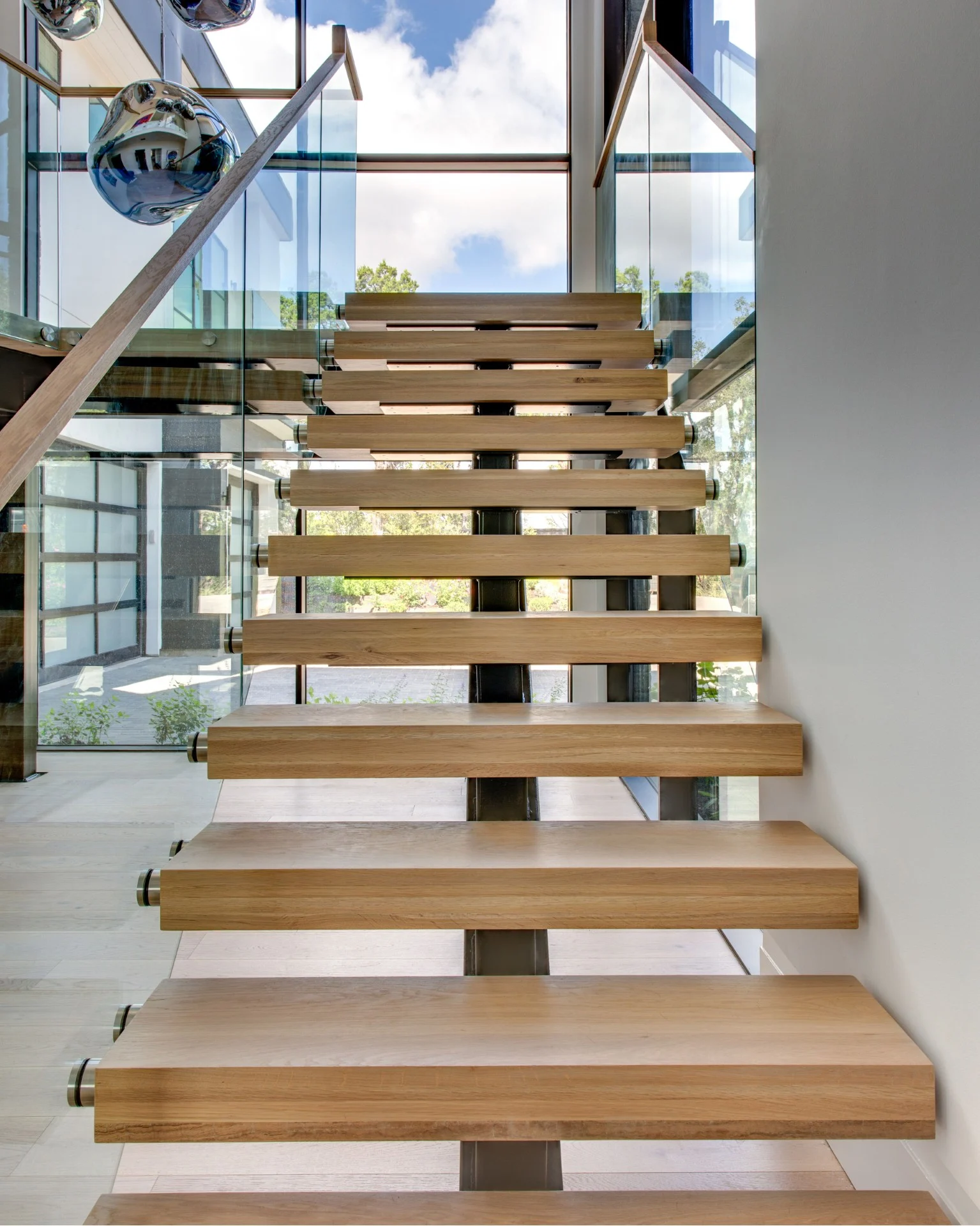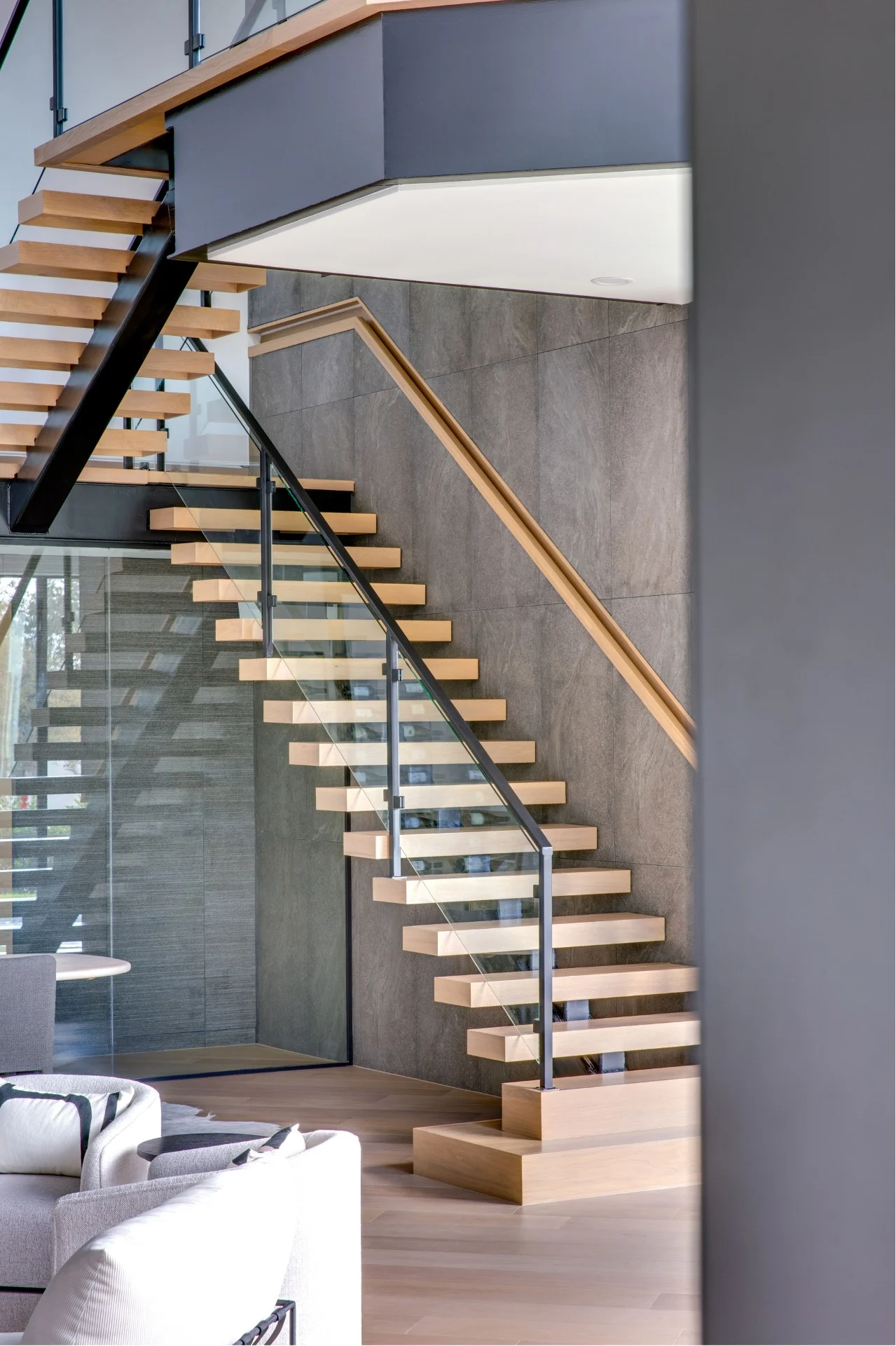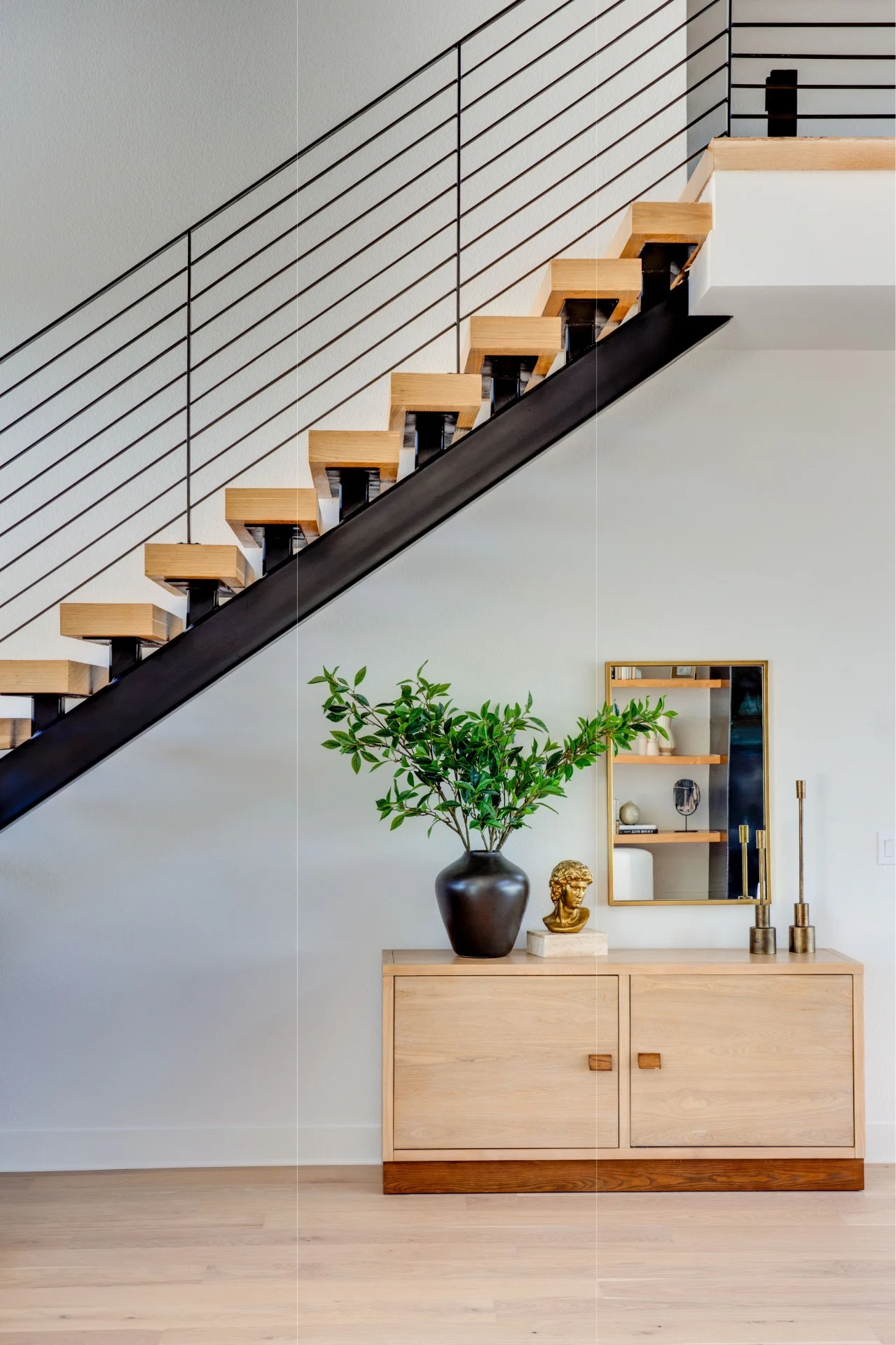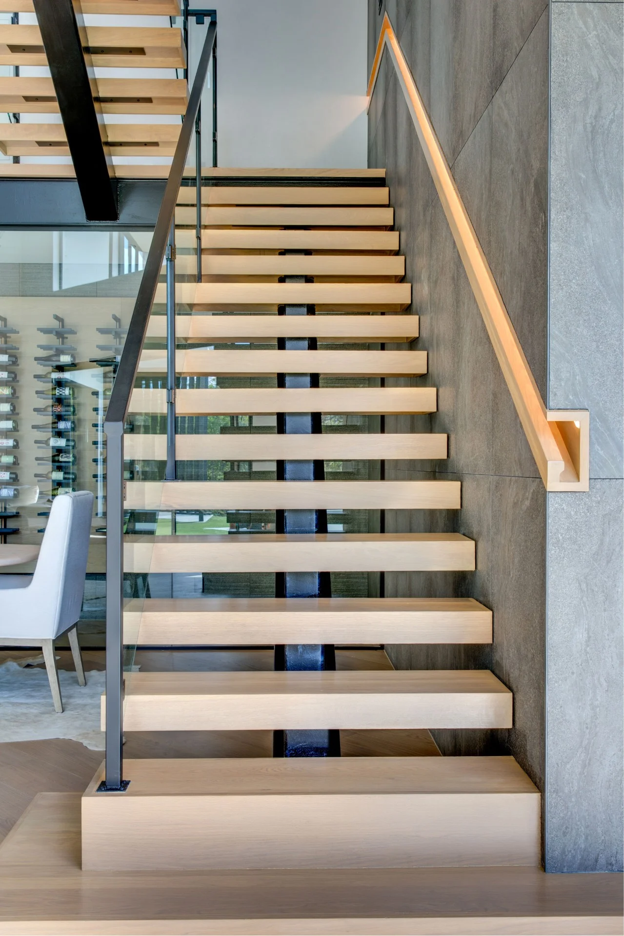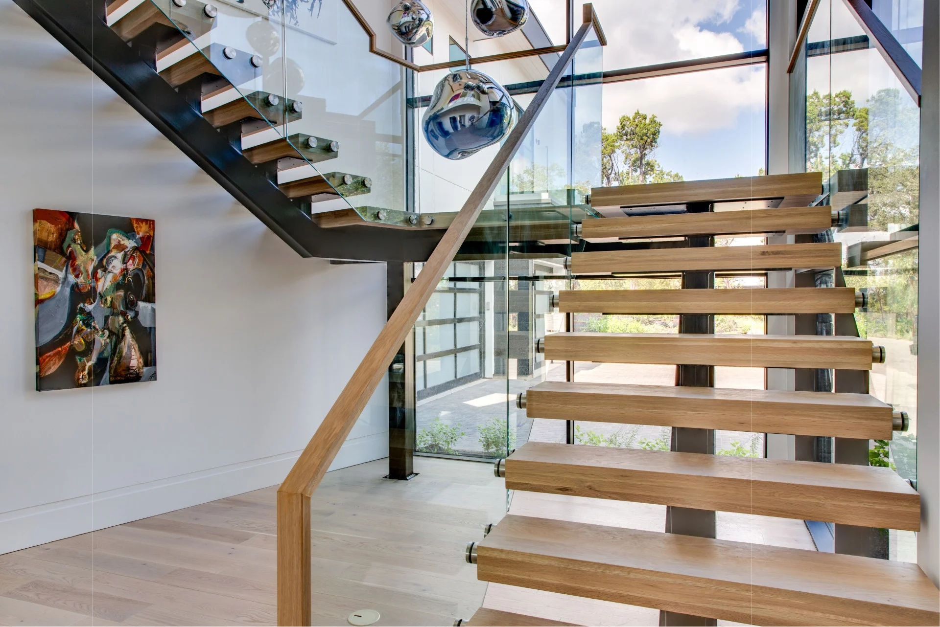 Make a statement with a floating staircase that appears to defy gravity. Our floating mono stringer designs offer a clean, contemporary look—perfect for design-forward clients seeking a standout custom staircase in Austin.